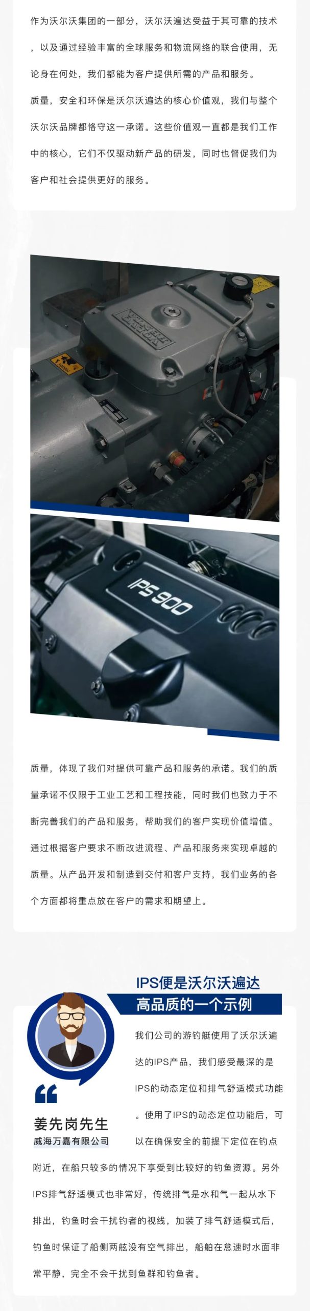 我國是海洋、航海大國,與航海相關的事業群,如航運、港口、漁業、造船、海洋石油開發等產業在我國國民經濟和社會發展中占據十分重要的地位。沃爾沃遍達作為海洋動力解決方案的提供方,始終以優質的發動機產品及配套系統和不斷革新的技術,助力航海相關行業的發展,保護海洋的原始生態環境。